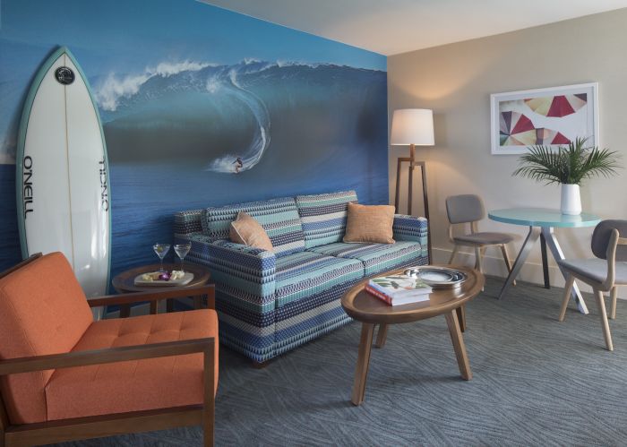 Dream Inn conjures the California beach lifestyle those of a certain age remember well; and younger guests—those who don’t know every Beach Boys song by heart—will find themselves equally enthralled. (The numerous surf shops surrounding the hotel provide ample opportunity for guests to emulate Dream Inn’s décor scheme at home.) Ocean blue dominates the color palette while surfboards and sea murals punctuate walls, halls, and elevators, with more-than-overt nods to its hang ten heritage. Whether surfer or landlubber, guests can’t help but to fall under the hang-loose spell that permeates the property.