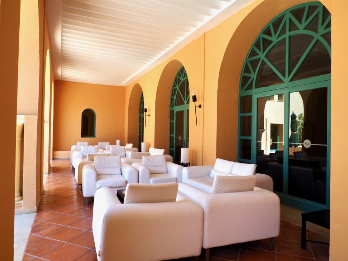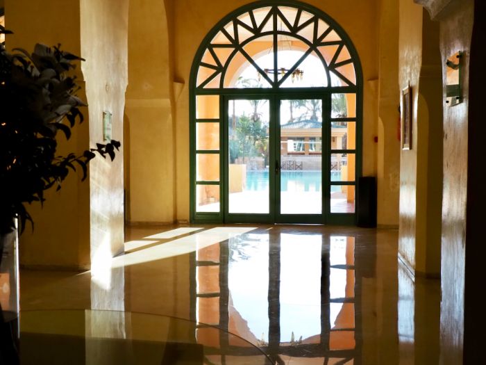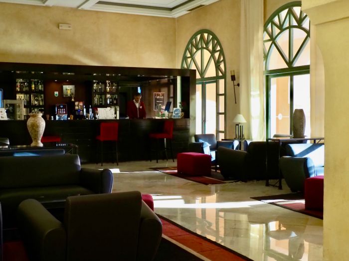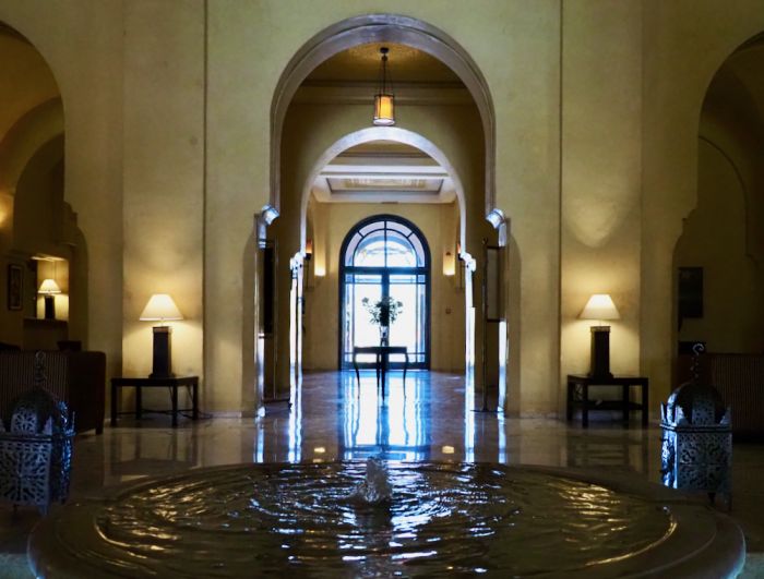 Inside, just beyond the reception desk, a vast atrium with ochre-colored walls towers high above in an open foyer to an intricately painted ceiling, Andalusian-style, with arches and marble columns along the sides, metal railings indicating each of the three floors of rooms.