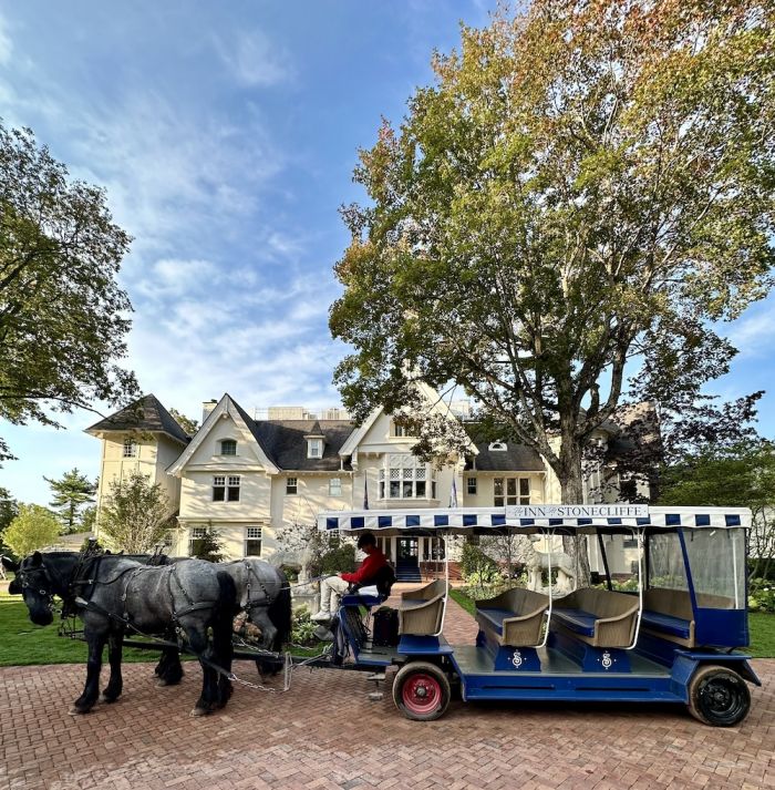 The Stonecliffe experience begins with a 45 minute horse-drawn carriage ride from the island’s ferry dock to the resort. The rhythmic clippity-clop of horse hooves is surely Mackinac Island’s soundtrack; modes of transport here are horse and bicycle, the two images of which grace the souvenir t-shirts and hoodies sold within the many boutiques along bustling Main St. The island’s long-standing auto ban was first enacted in 1898, and it has held steady since, serving to preserve the island’s natural beauty and timeless charm. For this California girl, where parched landscapes dominate, the carriage ride through lush green forests to Stonecliffe’s vast front lawn entrance captivated. Verdant lawn, during summer? How novel.