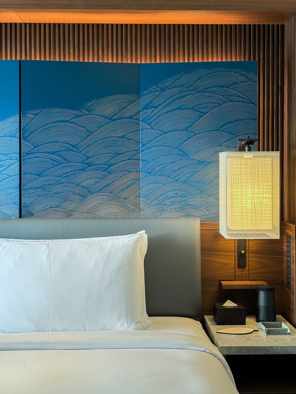Originally constructed in 1703 and meticulously restored, framing the hotel’s entrance is an impressive Kajiimiya Gate. Look closely and you’ll see it features faithful reproduction Tomebuta-gawara, or “sealed-lid tiles” adorned with peach motifs—regarded in Japanese culture as symbols of prosperity and good fortune—with the original tiles now preserved and displayed throughout the property. Beyond the imposing entryway, a bamboo-lined path guides guests to the lobby, where a ceramic sculpture by artist Yukiya Izumita serves as the focal point, complemented by a striking shoji-inspired lantern suspended overhead. Original artworks like these are woven throughout the hotel, from a ceiling installation evoking kimono fabric to a series of ceramic moons cradled in bamboo clouds, forms shifting on each guestroom floor to mirror the waxing and waning lunar phases.