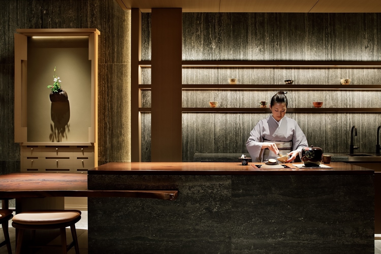 Envisioned as a modern interpretation of a traditional tearoom, Fu wove walnut and tatami with sleek furnishings across the 160 rooms and suites, creating spaces that feel intimate yet spacious. Custom joinery pays homage to Kyoto’s carpentry heritage, while wall panels showcase woven textiles by kimono designer Jotaro Saito. Bathrooms are havens in themselves, each with a stone-hewn soaking tub that invite unhurried relaxation. For the ultimate indulgence, there are two Onsen Suites, sprawling but sophisticated 1,100-square-foot private retreats with outdoor tubs and exquisite living areas decorated with hand-carved sakura wood furnishings.