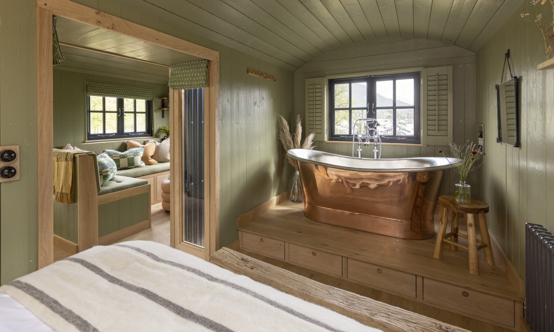 Inside, every detail feels considered but unpretentious—reclaimed wood, soft sheepskin rugs, and windows that open to the sound of rustling leaves and the distant, lapping water of Ullswater.