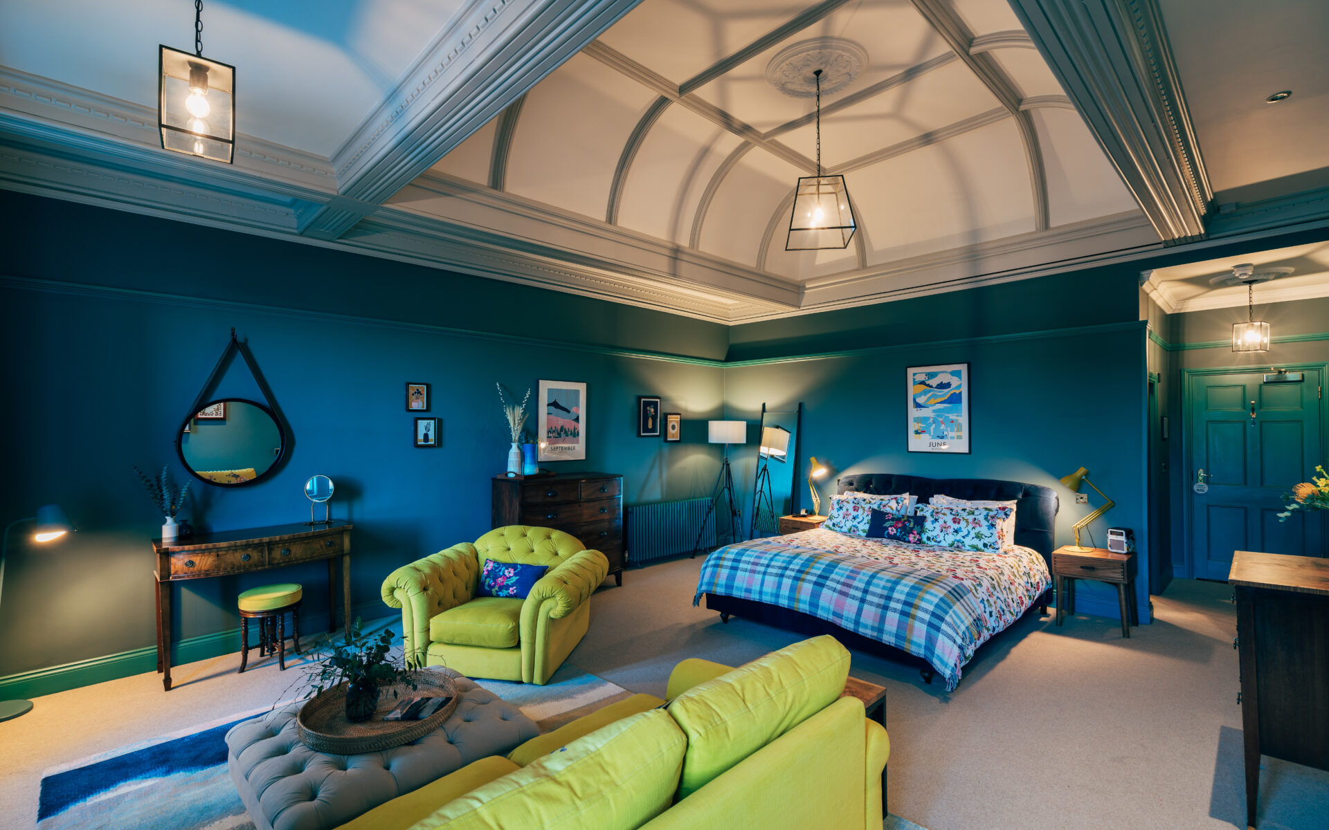 One of the most characterful rooms in the main house is the Joules Suite. Beneath its arched, vaulted ceiling, the room balances grandeur and cheeky charm. Painted in moody teal, it’s brought to life by vivid citron armchairs, a plump ottoman, and a bed dressed in checked linens. There’s a warmth to the space that makes you want to kick off your shoes and stay in. The artwork is eclectic but curated, and vintage wooden furniture is offset by playful modern lighting. Somehow, it all works—elegance without stiffness, colour without chaos. It’s the kind of room that makes you feel instantly at home, but better.