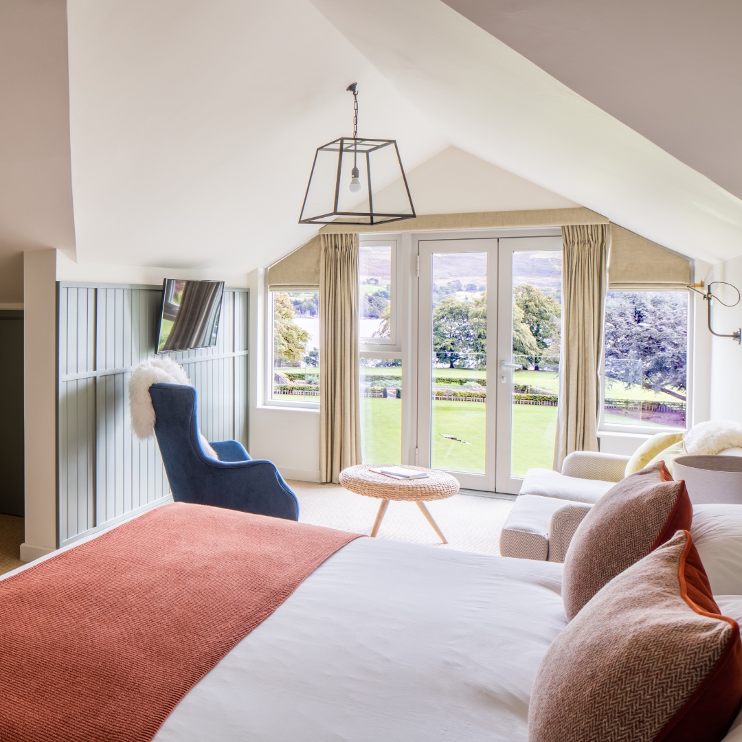 Another Place is more than a hotel—it’s a collection of experiences tethered to the land and water it inhabits. The main house is where the soul of Another Place lives. The original building, a Georgian home with arched windows, high ceilings, period mouldings—have been respected, but the interiors feel anything but dusty. It has the easy charm of a country manor, with velvet armchairs, log fires, and a library designed for long afternoons. But the styling is clean and current—no chintz, no fuss. Instead: natural fabrics, curated art, and a palette of deep blues, mustard yellows, and modern art bring a playful energy. The new wing, meanwhile, brings a more Scandinavian sensibility—lighter woods, more glass, and unobstructed views across the lake.