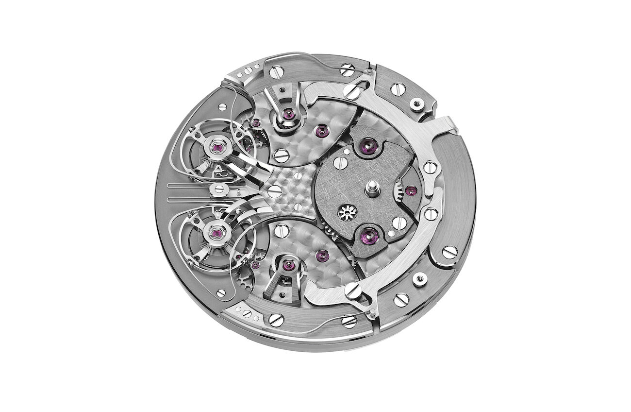 The new dark blue off-center dial matches the twin resonance second counters, both of which are also finished in the same blue tone and painted with white numerals. The open-worked second’s dials (with their triple-arm hands) can be reset to zero by the pusher at 2 o’clock.