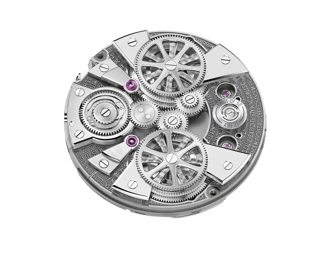 These newly colorful elements, unusual enough on any dial, share the space with another component not seen on any other resonance-based construction: a one-piece steel Resonance Clutch Spring.