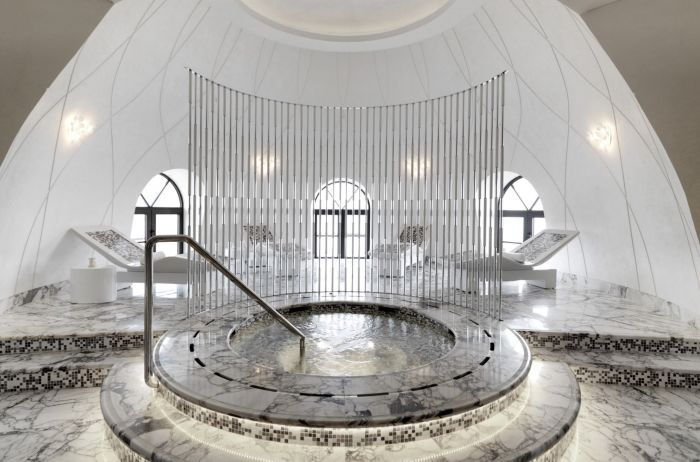 Another advantage of this Four Season’s location is the views and space offered by its penthouse level spa. I love a spa that has a transcendent feel, an escape even further from the resort or hotel that contains it, and the Four Seasons Baku delivers. The indoor pool area has a cathedral essence with natural light that pours in from curved lattice windows two stories or so above the mosaic tiled pool. The hot tub area, surrounded by heated stone lounge chairs, offers peek-a-boo views of the Caspian Sea. I booked a Jaleh massage with an expert therapist, Gracia. She’s been with the Four Seasons brand for a decade and a half, and I could tell she loved her craft. The massage incorporates velvet like Moroccan Argan oil, a divine treat after a chilly day trip I took out to the village of Guba. The spa has nine treatment rooms, enough to accommodate groups which is a popular booking for locals and bridesmaid parties, I learned.
