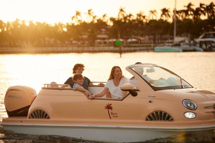 One of five hotel concepts within The Boca Raton, Beach Club is where luxury and leisure meet in breezy harmony. Though decidedly luxe, an easy, lighthearted vibe fills the rarefied air. Its seaside whimsy is evidenced by Sorbetto, the resort’s branded Fiat 500, a custom-designed boat that adds a dash of Italian flair while offering a fanciful way to explore the Intracoastal Waterway. It’s essentially a transformed Fiat 500—small, sleek, and complete with all the charming details you’d expect from the beloved car brand. It’s perfect for a leisurely cruise.