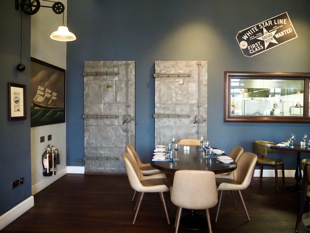 Naturally, all hotel bedrooms here have nautical personalities with art deco furniture, ship’s lanterns, riveted panels and maritime-related artwork. In our room, floor-to-ceiling windows with an opening of almost 180 degrees overlooked the very place where the world’s largest ship was built. Two leather armchairs and a small table window-side granted convenience for viewing these historic places below. Black and white tiles on the bathroom floor were reminiscent of the ship’s flooring while industrial design featured heavily, with various ship parts adorning the bedroom walls plus vintage iron bedside lamps, cabinets and a writing desk.