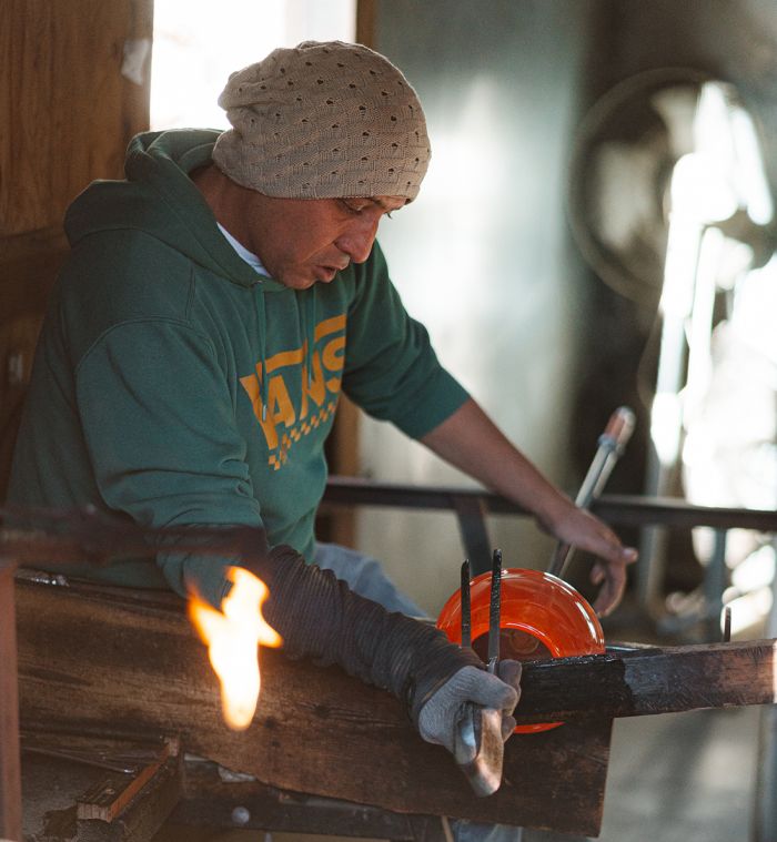 Watch the artisans at the hot shop create stunning, recycled glass art pieces.