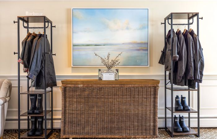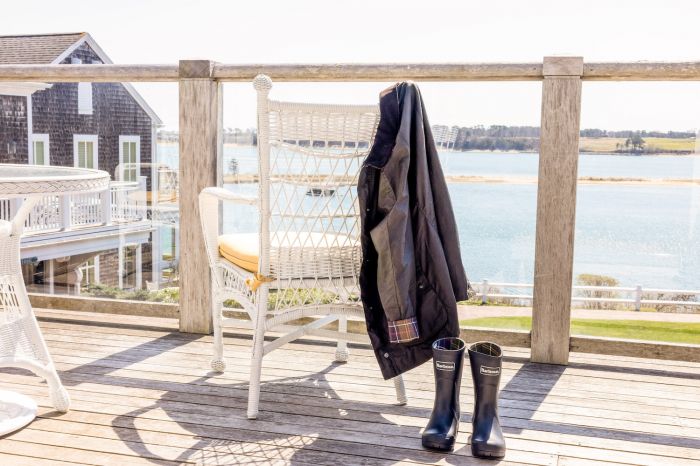 In addition to outfitting hotel staff in Barbour uniforms and offering a curated selection of items in the gift shop, the Wequassett Barbour experience features The Borrowing Closet. Located next to the main check-in desk, assorted Wellington boots and waxed coats and jackets are available in several colors and sizes for men, women, and children to check out on a complimentary basis.