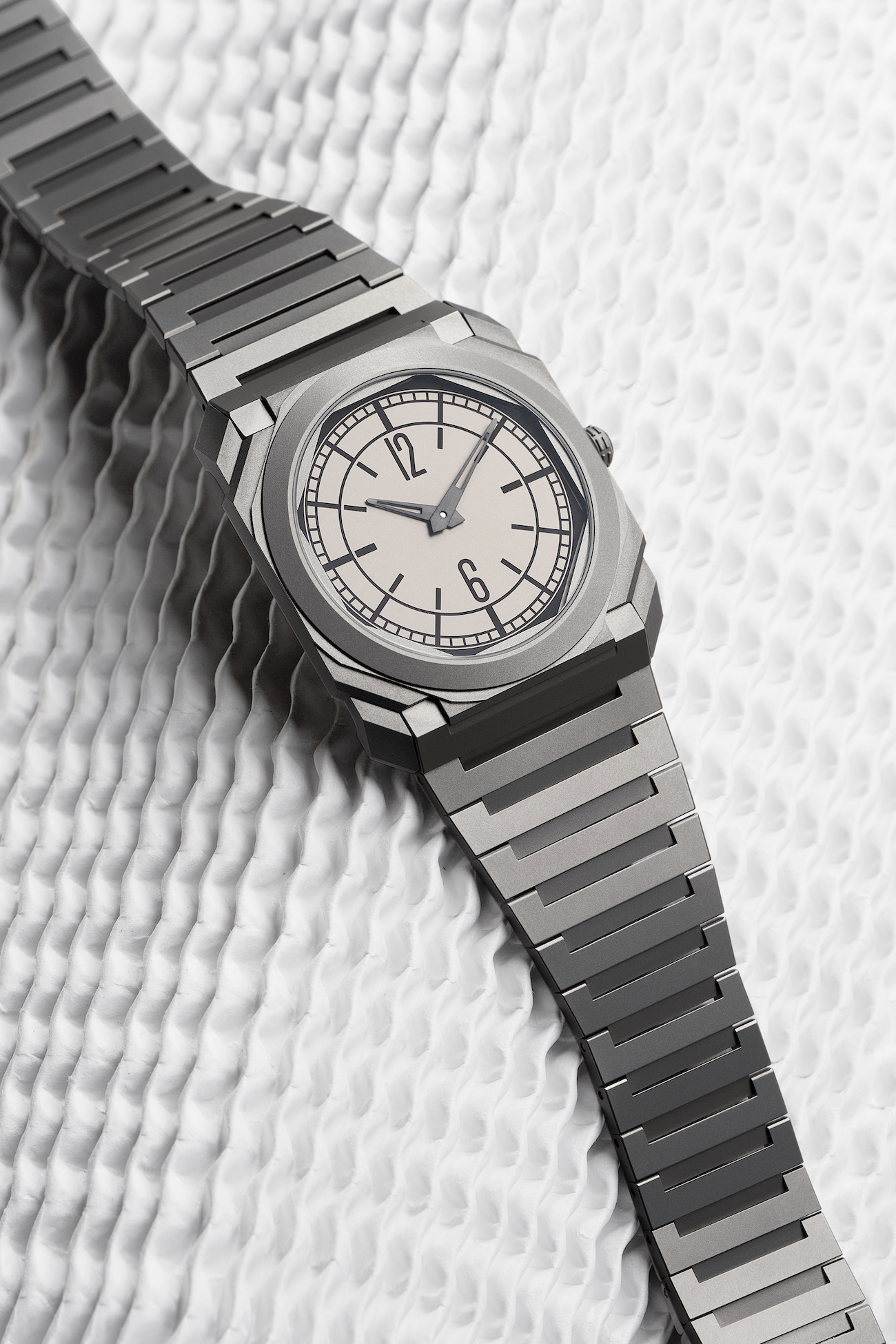 Since Bulgari designs always reference Roman architecture, the new special edition also retains the Roman sense of geometric symmetry. Thus, around the center of the sand-blasted titanium dial, you’ll see a symmetric set of engraved markers with only the 12 and 6 breaking the pattern. The new watch eliminates the seconds subdial found in the historic Octo Finissimo design, a decision that highlights the full round dial within the eight-sided case.