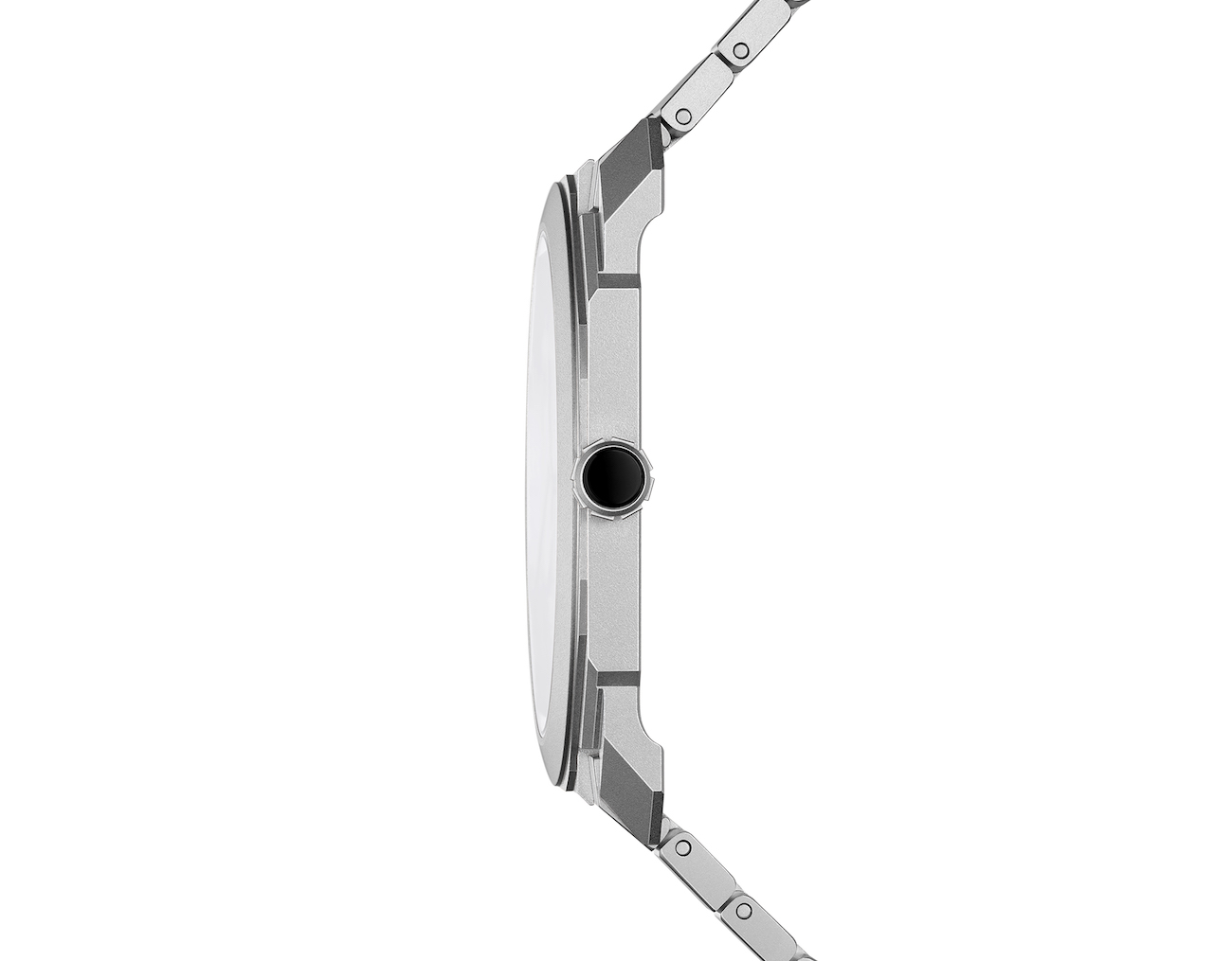 The thin 40mm case and the bracelet are finished to match the dial in sand-blasted titanium.