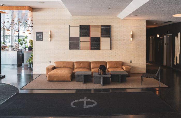 Visitors will no doubt notice the colorful walls in central areas, and in the exercise equipment-stocked fitness room. The Emily partners with local artists such as Raspy Rivera to provide the modern graphics that rev-up the hotel’s energy level. Guests can rev-up their own energy level at the lobby located Coffee Bar featuring locally roasted Sparrow Coffee and freshly baked pastries from local cult-favorite Dan the Baker.