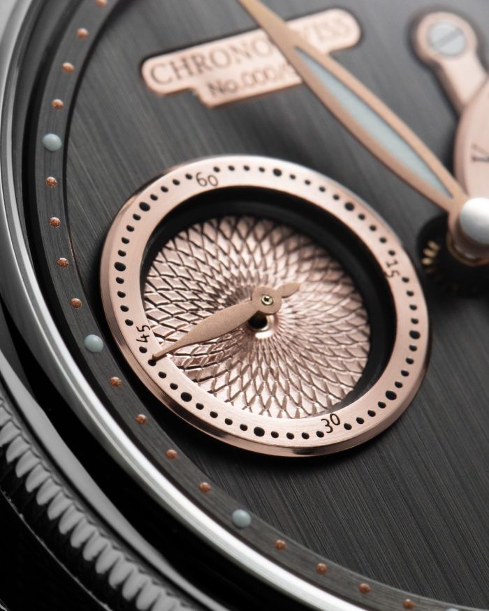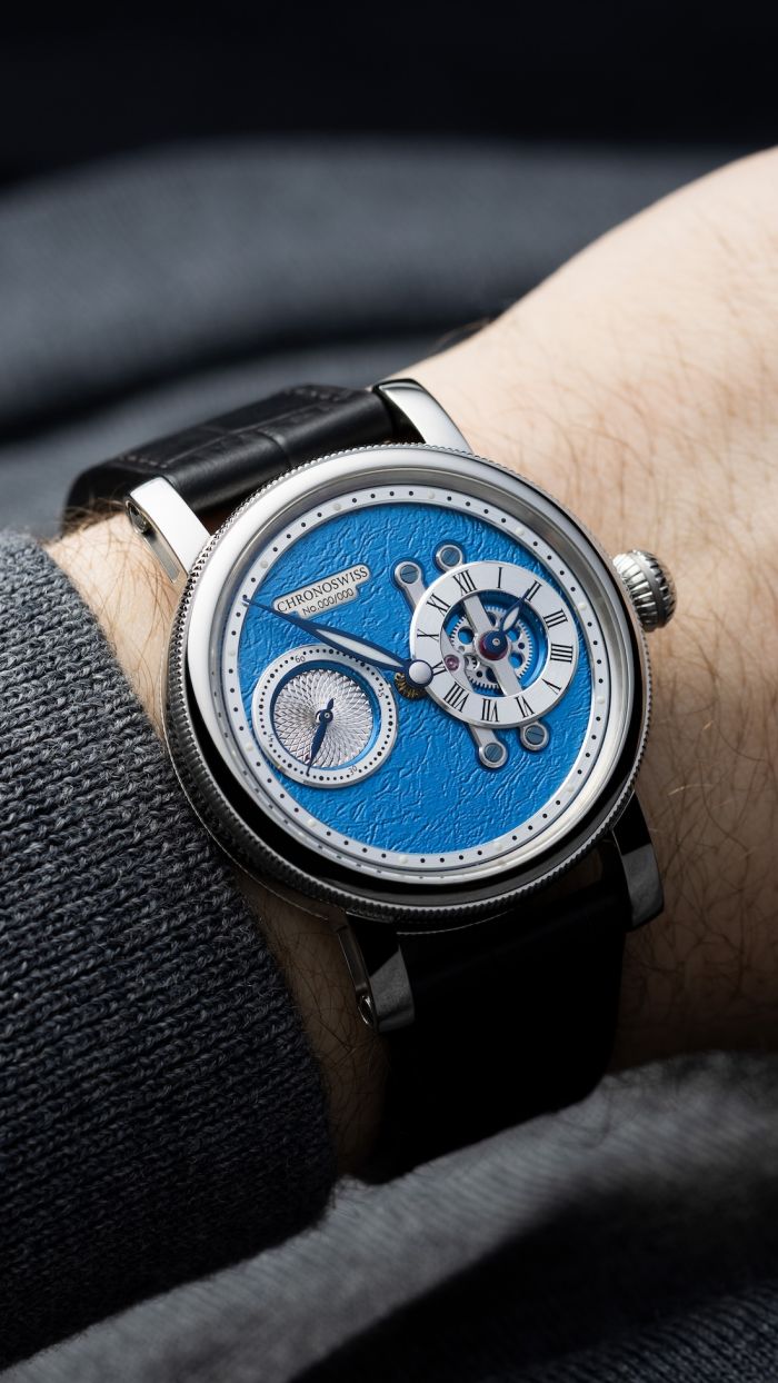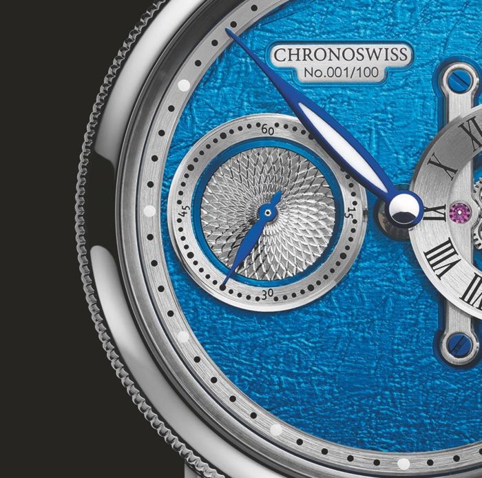 Known for its beautiful hand-guilloched craftsmanship, Chronoswiss places a sample of this artisanal expertise within the small second dial, which is beautifully finished with a floral pattern.