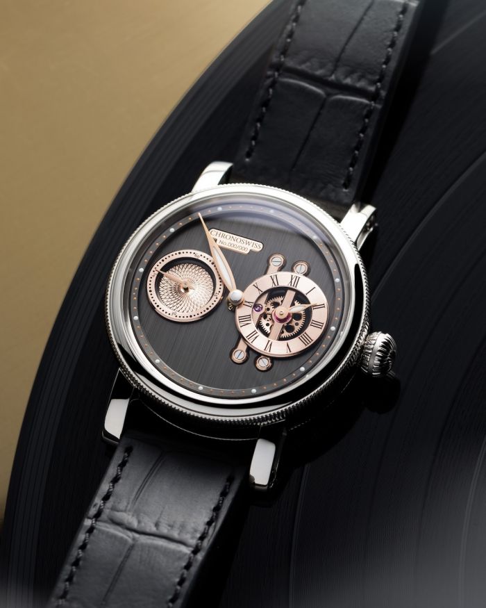 Echoing existing Chronoswiss regulator-dial watches with a vertical layout, such as its Open Gear series, the new Strike Two offers a familiar, contemporary Chronoswiss look but with a slimmer, smaller case that places its hour subdial at the 3 o’clock position instead of at the top of the dial.