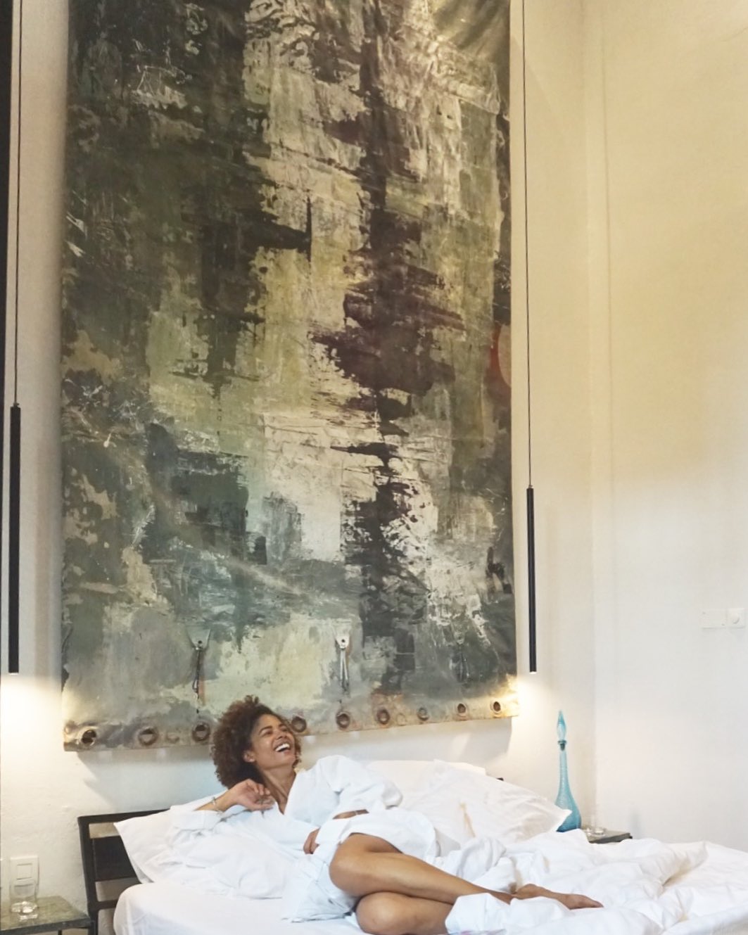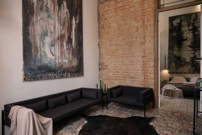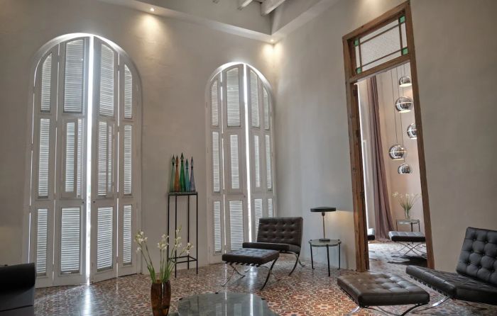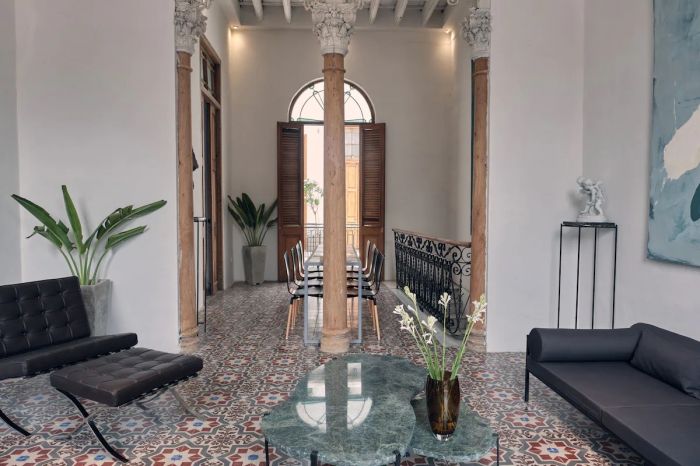 While the design of the exterior is baroque and ornate, the interior contrasts with a sleek and minimalist design with 16-foot ceilings, open spaces with a neutral color palette, original Cuban tiles, and muddled light filtering through the wooden louvered doors. Throughout are contemporary touches such as industrial lighting, antique Cuban tiled floors, rustic brick walls, and hand-blown Venetian-glass vases as accent pieces. What impresses most are the large abstract paintings that are sure to capture the admiration of guests. The artist is none other than Andre the property owner who is a highly regarded artist in his own right with works exhibited in Madrid, Paris, Amsterdam, Rome, and Havana.