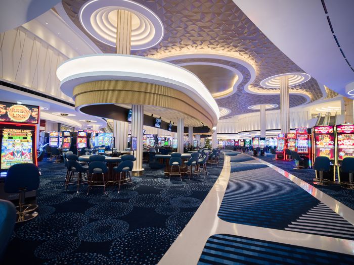 Pulling up to the hotel, guests are enveloped in instant extravagance. Floral displays can be found at almost every entrance, and the check in lobby makes you stop and stare. A fun game to play on property is to seek out the signature bowtie design, hidden cleverly in everything from chandeliers to wallpaper patterns, lighting fixtures, carpets and more. Even some of the croissants found in the cafes incorporate the bowtie motif. With over 150,000 sf of casino action, the fun doesn’t stop on the gaming floor. A poolside casino sits adjacent to the sprawling pool area and hidden gems can be found throughout the property. BleauLive Theater welcomes touring acts from across the globe, decidedly different than residencies, in the 3,800 person theater.