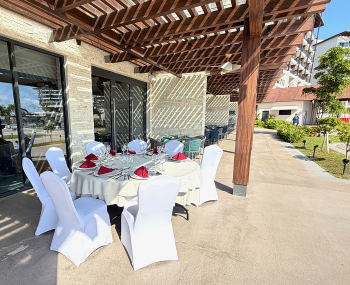 A garden clubhouse or terrace with palm trees and verdant green views of the golf course is popular with golfers. There are also indoor options for receptions in case of inclement weather or for those who seek a more private setting.