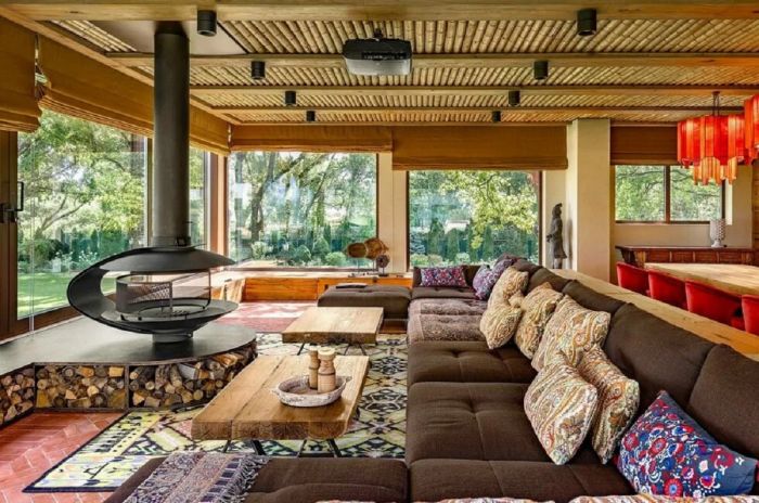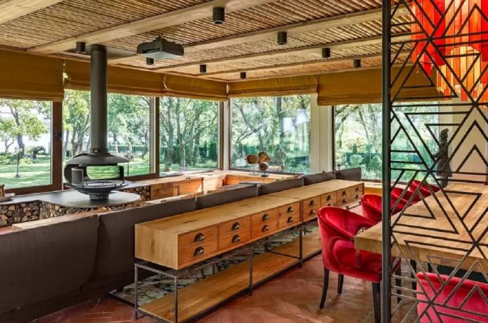 Meanwhile, the elongated sofa ensures guests get a full view of the outside and the open fireplace. The Enjoy in Silence Chalet is an ideal serene destination for the weary traveler.