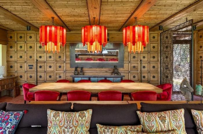 From the entrance, the open floor plan features a metal screen with intricate patterns to separate the dining area. Ornamental lighting fixtures add another attractive visual element to its interior design.