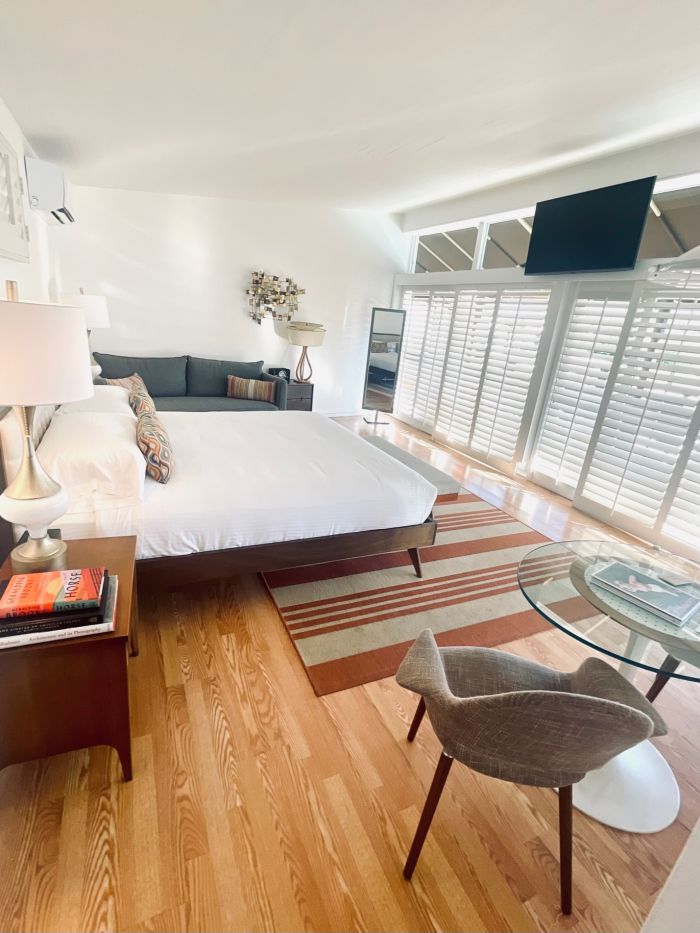 In the upstairs Julius Shulman guest room, named after the famed architecture photographer, this room has one of the best pool and mountain views. From the cloud-like king size bed, guests looking out the floor to ceiling windows can take in the sunrise on the San Jacinto Mountains and Palm Springs Valley.