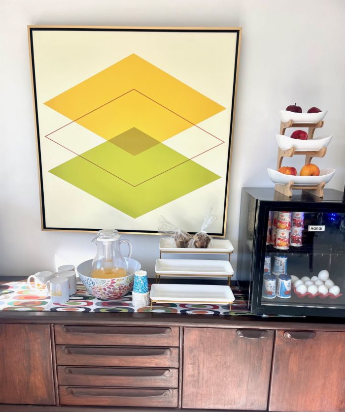 There is a mid-century kitchen complete with an oven, microwave, refrigerator, coffee maker, and blender, and microwave. The tiled bathroom is vibrantly styled in shades of green and yellow, with newly laid terrazzo flooring. New wood floor tiles with artisan rugs complete the living space.