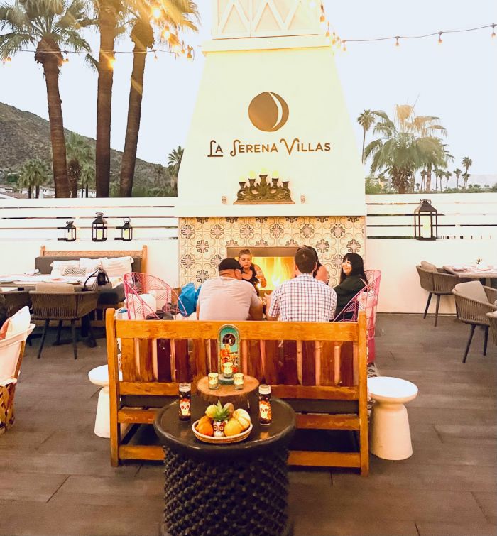 Upstairs is the special Sugar High rooftop deck offering a Palm Springs Bohemian vibe. Guests can order from the Azúcar full menu or have cocktails and appetizers at the lounge area next to the fireplace.