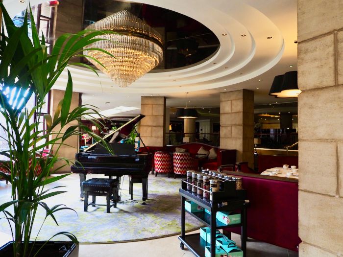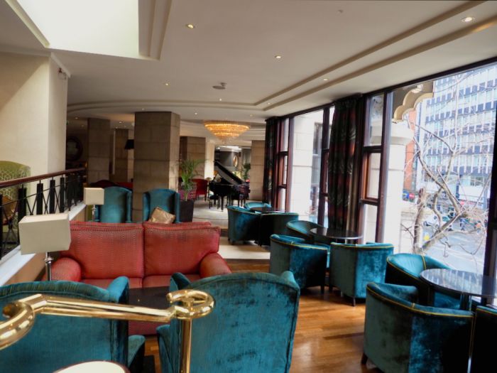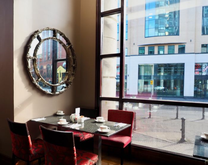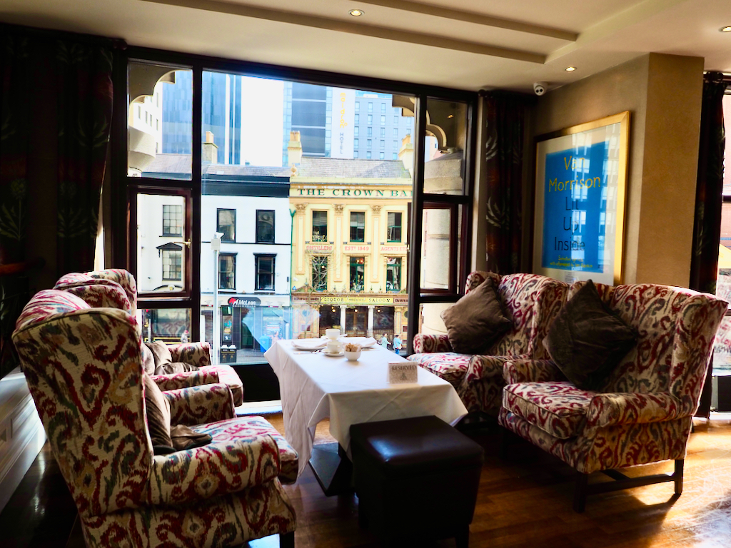 A grand entrance off busy Great Victoria Street leads into the hotel’s spacious rotund lobby with its ornate columns and gleaming marble floor, the reception desk being straight ahead, a bar to one side and a restaurant on the other. A winding staircase leads to the first-floor Piano Bar where traditional afternoon tea is served.