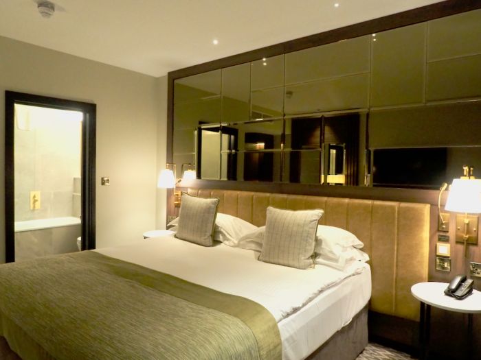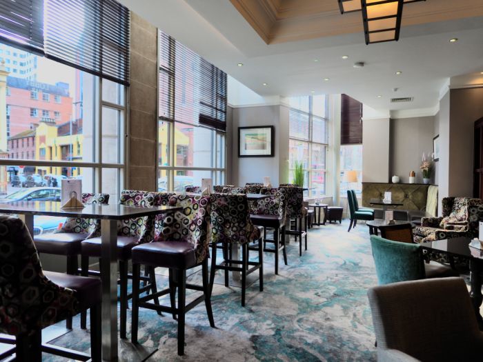 Our room 923 granted us a broad view over downtown Belfast and bustling Great Victoria Street below. Its modern décor comprised carpeted and wood floor, combined bath and shower, convenient reading lamps, two armchairs and a round coffee table. Appliances included flat-screen TV, kettle, ironing board and coffee-maker.
