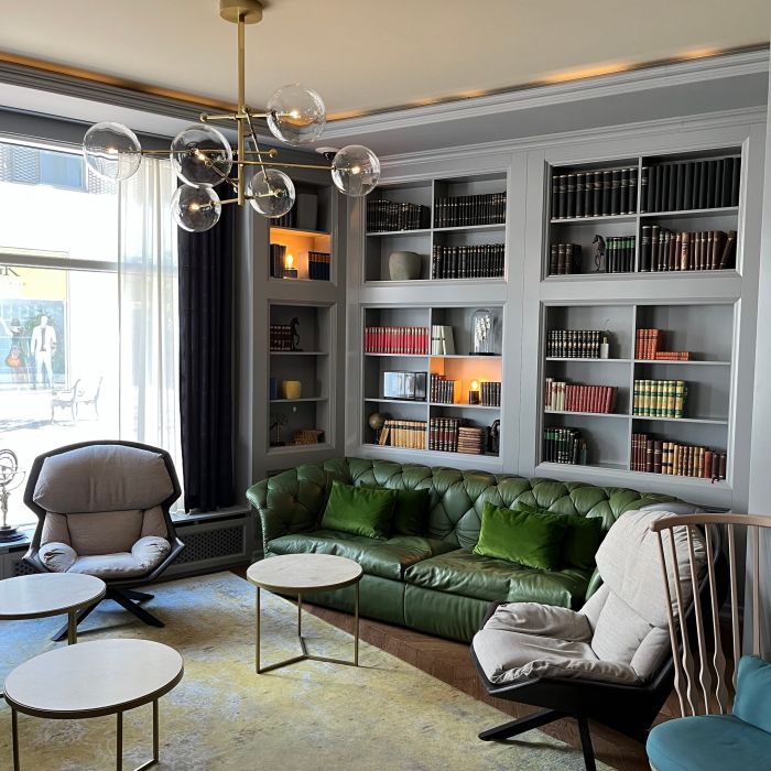 Stepping into the hotel rooms, one can instantly sense the noble old-fashioned taste inspired by the Consul’s spirit. Black and white images and artwork are hung above the upholstered king-sized bed frame. Wooden desks and cabinets remind of a diplomatic office interior. A Chesterfield-style sofa compliments the vintage yet modern rest of the décor in the suites. Some of the modern amenities feature HD televisions, espresso machines, and a safe. The sizeable windows bring light into the room and overlook the Nordic city of Reykjavik. Some of the bathrooms in the suites expose the original wall of the building and feature golden elements, a walk-in shower, and mosaic wall art.