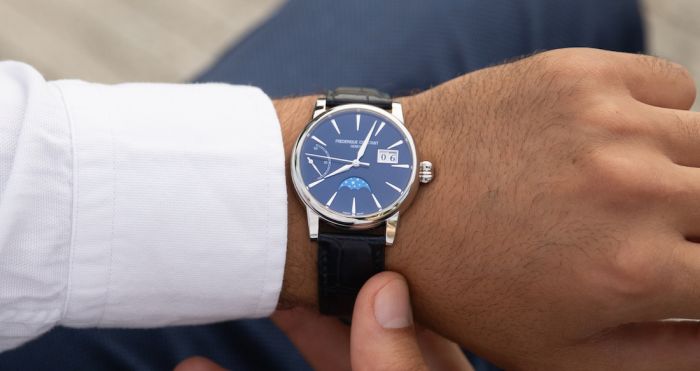 Frederique Constant notes that the FC-735 is the watchmaker’s first caliber to offer a big date, a moon phase, and a power reserve indicator together in one watch.