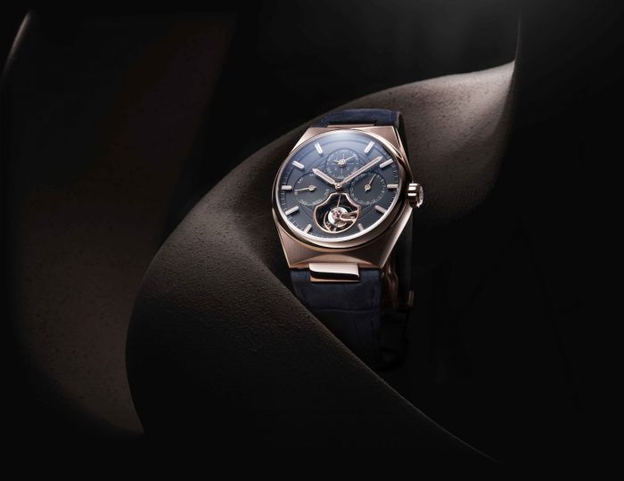 With a contemporary design, the watch melds both of its namesake technical complications within a blue dial, carefully adapting the upper half of the tourbillon aperture to fit alongside the calendar displays.
