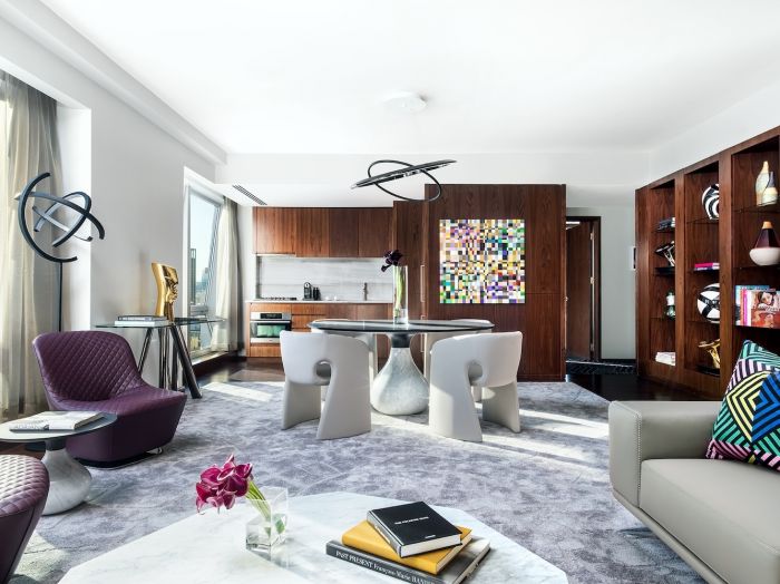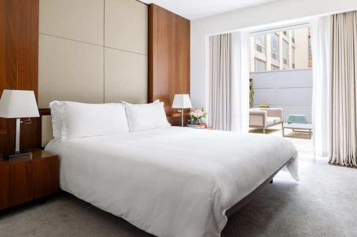 While the hotel’s décor is sleek, it is far from overly formal. It strikes a balance between modernity and classic luxury, making it accessible to a wide range of guests, from business professionals to tourists. Guest rooms and suites come in a variety of layouts: Deluxe Rooms, Junior and One Bedroom Suites, Executive Club Rooms, and the Presidential Suite. Many rooms offer stunning views of the New York City skyline, including the Empire State Building, and all are ultra-spacious by Big Apple standards. Each features sleek, furnishings, high-end finishes, and floor-to-ceiling windows that allow natural light to fill the space. Neutral tones and high-tech features offer a comfortable and quiet retreat. And the expansive marble bathrooms with deep soaking tubs are a particularly luxe feature.