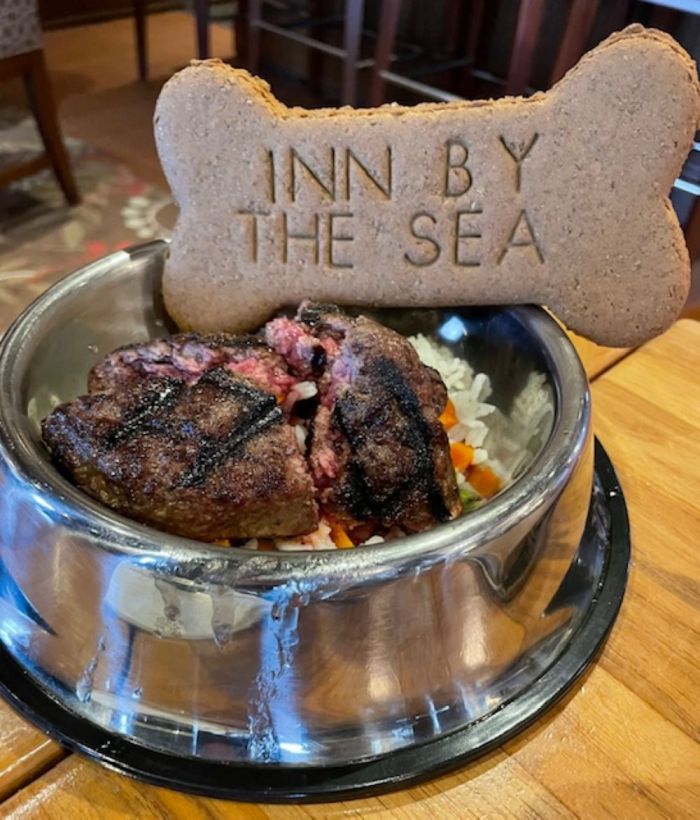 The pet-welcoming property not only provides dog beds, bowls, treats, and cleanup bags during your stay but they also have a custom chef-curated menu for them featuring specialties like a Molasses Biscuit; Meat “Roff” made with steamed rice, raw vegetables, and natural ground beef (our pup’s favorite); “The Bird Dog” with grilled chicken, steamed rice and raw veggies (both the chicken and beef entrees come with an Inn by the Sea inscribed biscuit); and K-9 ice cream, soymilk honey gelato topped with dog biscuit crumbles.