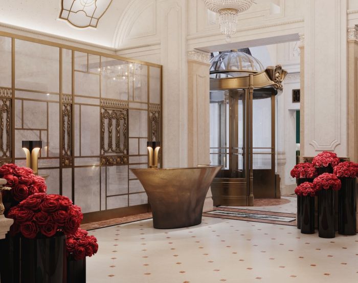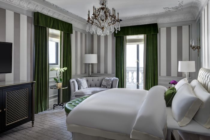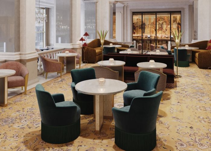 Now expanded with an open floor plan, the lobby extends into a welcome area, housing the concierge team, which features deep aquamarine walls and custom hand painted wallcoverings featuring peacocks, a nod to one of the original 1920s murals. The space’s original Tiffany & Co. chandelier hangs above modern furnishings, epitomizing the juxtaposition of old and new. The renovation also introduces a new dining venue, La Maisonette, serving breakfast, lunch and afternoon tea. The bright and airy space creates the feeling of an outdoor pavilion, inspired by the hotel’s original breakfast room from the 1910s and French design. Creamy white walls and a recessed skylight brighten the space alongside a palette of soft pinks, burgundy, emerald and turquoise.