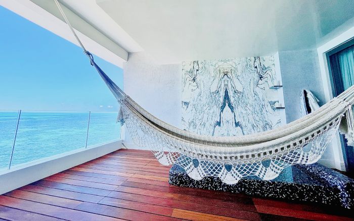 The beauty of this location is that it is much quieter than Cancun’s popular Hotel Zone. Since Hotel Mousai is part of the TAFER Group, guests have privileges to use the neighboring Garza Blanca Cancun Resort for dining, amenities, the spa, and 7 different heated swimming pools. There is an adult-only pool, a kid-friendly waterpark pool and a hammock pool to swing above the water.