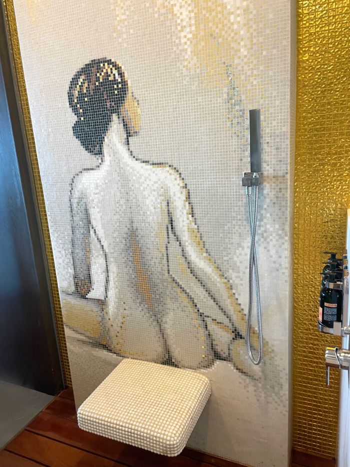 Bathrooms offer two sinks and a beautiful mosaic tile shower with two shower heads. Guests can use an iPad-controlled ambiance device for music, lights and curtain controls. Heated luxury Toto commodes are installed in every toilet closet.
