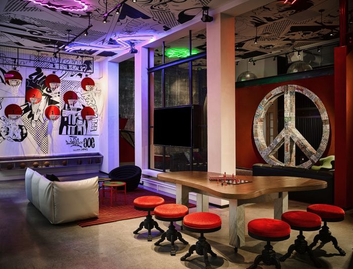 A lobby lounge features cozy sitting areas, as well as the Zeppelin Café, serving coffee drinks and breakfast items. Additional sustenance is found at lobby-adjacent PLS on Post, serving unique smash burgers and inventive, Instagram-worthy, “Groovy Milkshakes.” (Example: the Choco-Nut, with Reese’s Pieces, peanut butter, peanut butter cups, crushed peanuts, Guittard’s hot fudge, and a Luxardo cherry.)A 1,300 square foot lower level game room offers a playful retreat with Skee ball, shuffleboard, a quick-shot basketball wall, an oversized electronic Bingo board, and two jumbo televisions.