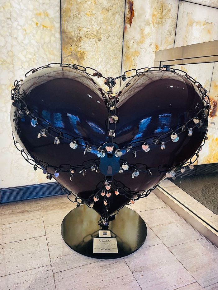 The second heart in the Wells Fargo lobby is ‘Leave Your Heart in San Francisco’ by Assemblage artist Beka Brayer. She is known to creatively incorporate found objects and upcycled materials in her work, seeking beauty in discarded items emphasizing the object and its architecture. Every one-of-a-kind piece embodies a specific destination, resulting in a representation that captures a significant moment in time.