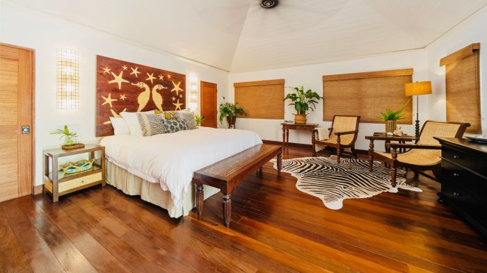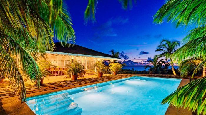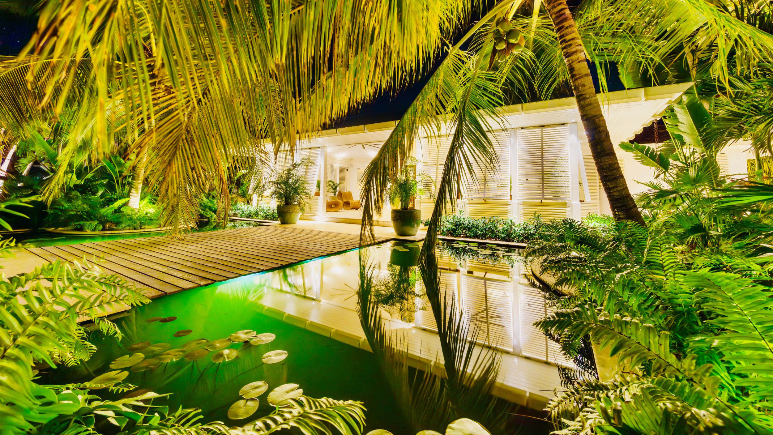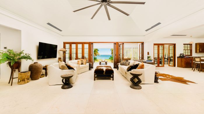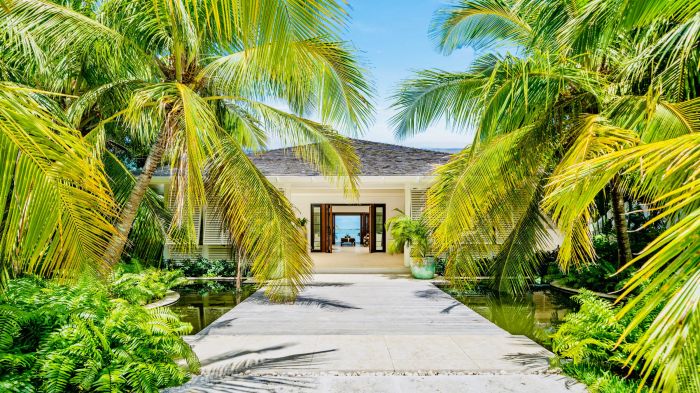 Past the entrance guarded by two magnificent white stone frogs, a drive through oversized pandanus and lush trees leads you into this paradisiacal retreat. Access to the main house is granted via a bridge spanning a colossal aquarium, creating an almost moat-like entrance. Surrounded by flourishing gardens and expansive turquoise waters, the main house is approximately 5,000 sq. ft. and welcomes guests with an open floor plan, which embraces island breezes through doors opening to the 80 foot long west veranda and east.