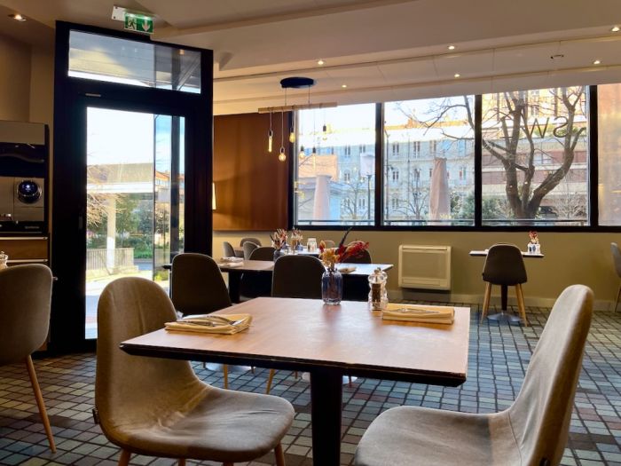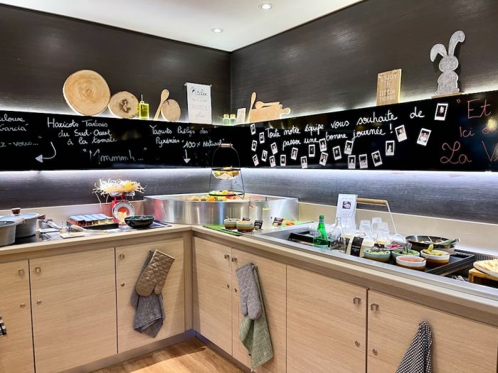 A varied buffet is offered with the names of local producers written in large letters on the wall above the food, including Toulouse sausage from Maison Garcia, cow and sheep milk from Bethmale and yogurt from the Pyrenees. Cheeses, cold cuts and excellent salmon slices are among the items with several hot dishes to choose from.