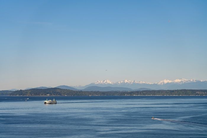 The hotel and its common areas overlook Elliot Bay and the surrounding Olympic Mountains and Cascade Range