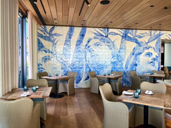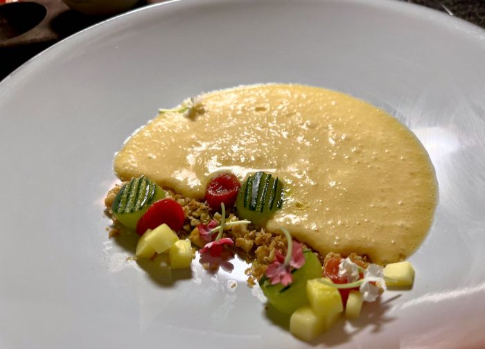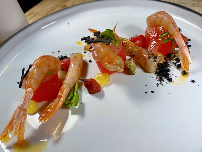 A coconut gazpacho follows, poured table-side to accompany pickled cucumber pearls and sun-dried tomato, a cooling interlude before our violet prawns on watermelon lounges, surrounded by sprinkles of octopus ink coral.