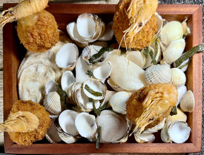 For dinner, my companion and I decided to start deep in the ocean and make our way slowly landwards. As we peruse the menu, we’re seduced by a dish of smoked olives and ‘bolo do caco’ – circular Madeiran sweet potato flatbread. Our starters of deep-sea croquettes – bonbons with a tofu-like filling tasting of savory prawn bisque, with a hat of small shrimp glued with yuzu gelée – arrive on a tray of cockle shells and salty ribbons of seaweed.