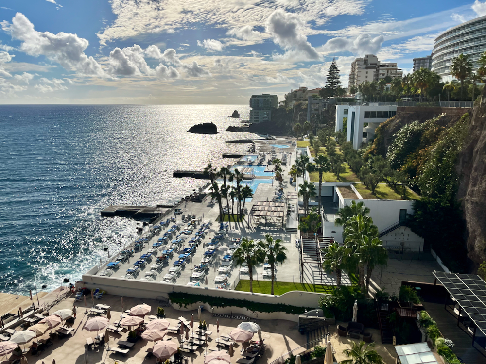 My favorite place to relax was beside the Infinity Pool Bar where drinks and assorted snacks are served every day. Here I enjoyed magnificent views across the glistening Atlantic Ocean and towards Funchal, layer upon layer of buildings gleaming in the bright sunshine, resembling icing on a cake, rising up the mountain to the forested summit.