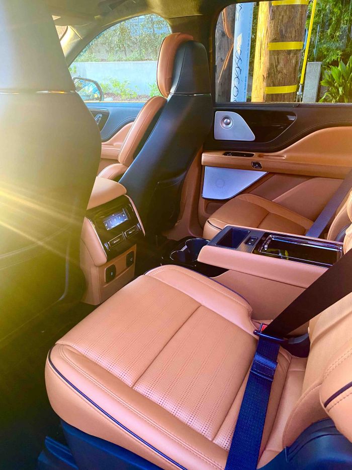 The big oversize grill features a blue Lincoln logo and honeycomb silver design housing the 360-degree camera. There’s also 21” wheels, a plugin option for charging and we loved the one-touch feature to open the trunk and flatten third-row seats for loads of trunk space.