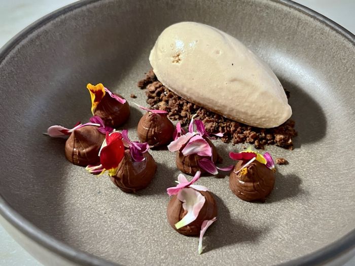 Mains ranged from roasted octopus and Thai pasta stew to Iberian pork and Alentejo lamb with eggplant. My companion chose blue lobster, which came as two generous slices, jacket-less, body and claw. The accompanying bisque-like sauce based in part on marrare, a 19th century classic recipe prepared with meat stock and cream. I chose beef loin aged 35 days with a crunchy chestnut puree and Szechuan sauce.