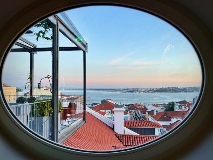 Dining is at Bahr restaurant on the 5th floor, reached by one of two elevators, the other going to a 6th floor rooftop bar. Both places have outdoor patios with panoramic views over the city and the River Tagus.