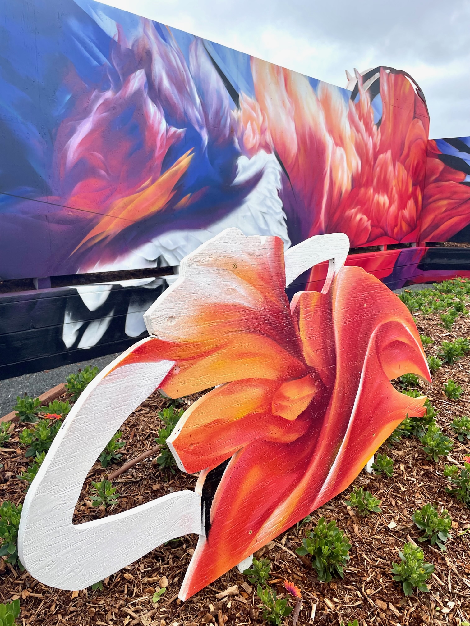 Thao Huynh French ‘Live Colorfully’ mural in the Butterfly Garden area, is a thought provoking communal space of solitude. In a statement, French shared, ‘In an environment full of overstimulation, distractions and chaos, this piece is designed as a form of refuge for the mind and soul.’ She uses flowers in her work a lot as a love language to herself and to others.